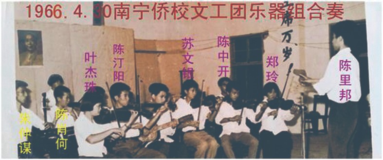 学校从各班抽调文艺骨干组织了文工团,有乐器组、舞蹈组等。排练大型歌舞表演《长征组歌》,准备参加南宁市中学文艺汇演。我与二弟因会弹班卓琴、拉小提琴,而参加了学校文工团的乐器组。同乐器组的有陈式利、陈中开、苏文银、叶杰珠、郑玲、朱仲谋、陈肖何等同学,还有印尼归国会拉手风琴、弹吉它的侨生。我们的演出非常壮观、十分成功,博得了观众们持久不息的掌声。