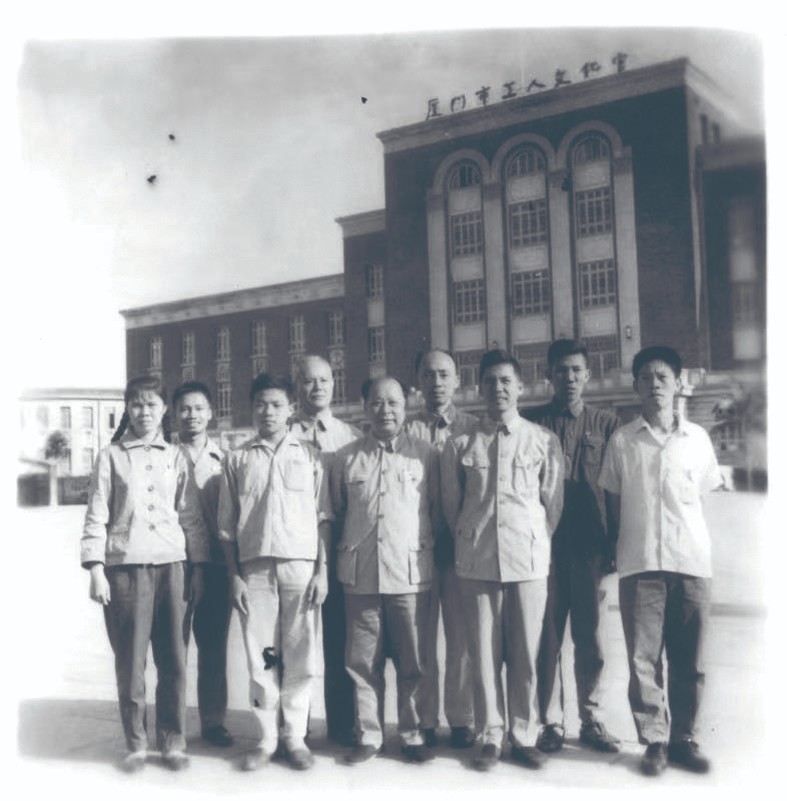 黄瑞成(后排左三)与当时市委统战部施耀部长(前排左三)、张其华副部部长(前排右二)、市侨联颜西岳主席(后排左二)于上世纪六十年代在原市工人文化宫前