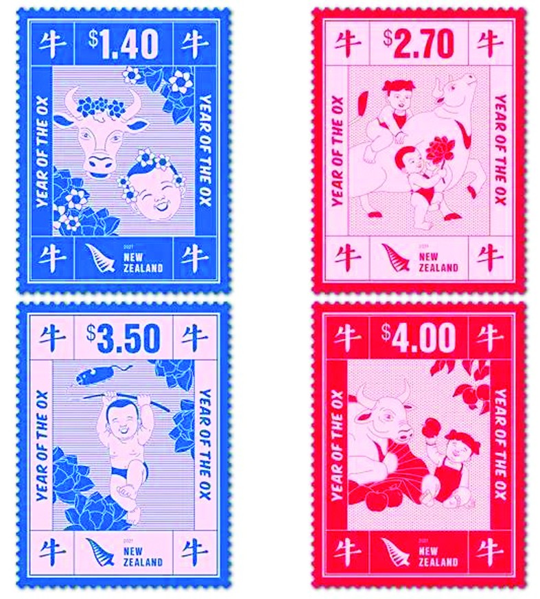 新西兰于2020年12月2日发行了牛年邮票,迎接中国农历牛年到来。这套邮票均以牛和孩童为主角,色彩红蓝相间,犹如一组“中国年画”,象征着幸福、财富、自由与和平,真是浓郁的中国年画风格。