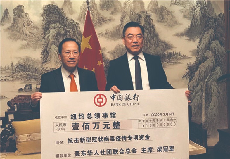 当地时间3月6日,美东华人社团联合总会(下简称“总会”)主席梁冠军捐赠100万元人民币,作为抗击新冠病毒疫情专项基金,并委托中国驻纽约总领事馆转交国内相关部门。此前,梁冠军与总会荣誉总顾问邵连武、朱三东三人已捐赠了10万个N95口罩支援祖国抗击疫情。