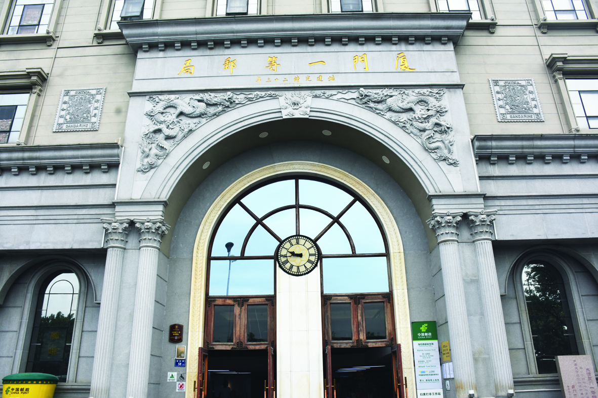 在鹭江街道海后路58号,坐落着一栋仿英式白色小洋楼,精美的龙纹雕花,青灰色的罗马石柱,木质的拱门,还有拱门上那明净的玻璃,显示出一种优雅的年代之感。龙纹之上,“厦门一等邮局”六个金色的大字藏在婆娑的树影之后,偶有阳光落于其上,泛着淡而温柔光芒。