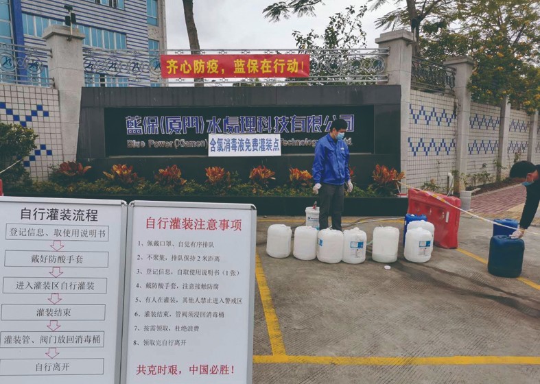 市侨联常委、市侨商会副会长、蓝保(厦门)水处理科技有限公司总经理吕奋勇在得知防疫一线和多家侨企紧缺复工急需的84消毒液后,立即召集蓝保水处理公司防疫小组成员确定配制方案、成立消毒水免费发放组,积极配合集美区政府配置了一批含氯消毒水,首批推出200吨散装消毒液,除免费供应正在复工投产的侨商会会员单位外,还无偿提供给抗疫一线、镇街村居、学校、医院、企业店铺等,宝龙集团、厦门优盾农业科技、雅特尔实业有限公司等20多家侨资企业及新侨企业众多的火炬高新园区等单位先后领取了消毒液,保障了各单位及企业复工前的日常防疫消杀工作。