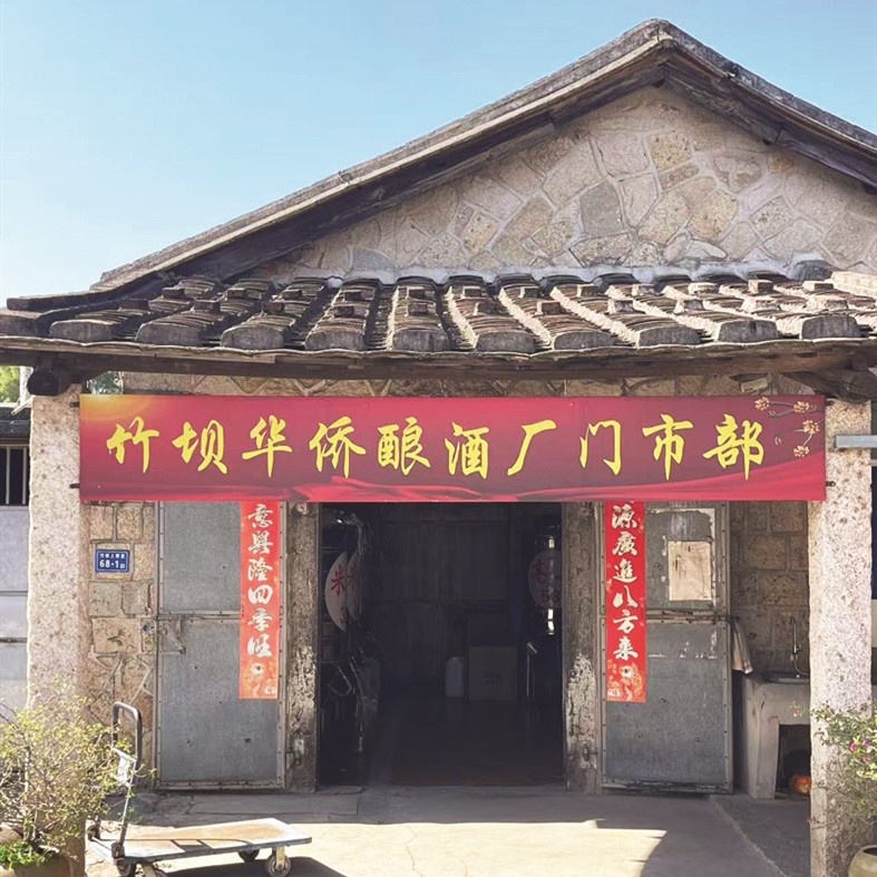 从归侨史迹馆往北走一公里,就来到了竹坝华侨酿酒厂。清风徐来,空气中飘来阵阵酒香,沁人心脾。华侨酿酒厂成立于1959年,产品包括高粱酒、黄酒等品项。酒厂传承南洋古法酿酒工艺,手工纯粮酿造,“浸米-蒸饭-摊饭-拌曲-蒸酒-装坛”,每一道工序都有几十年酿酒经验的老师傅把关。